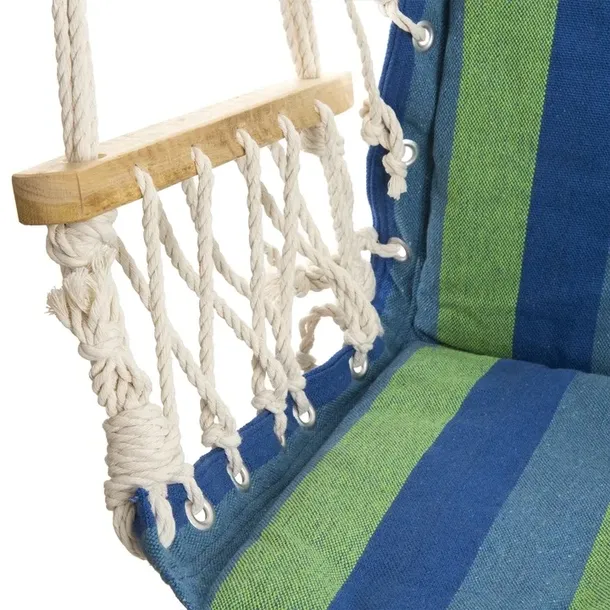 Miękkie, bawełniane wypełnienie siedziska i oparcia zapewnia niezwykłą miękkość i wygodę. Drewniane podłokietniki umożliwiają relaksujące ułożenie rąk, a grube sznurki dodają trwałości i stabilności.